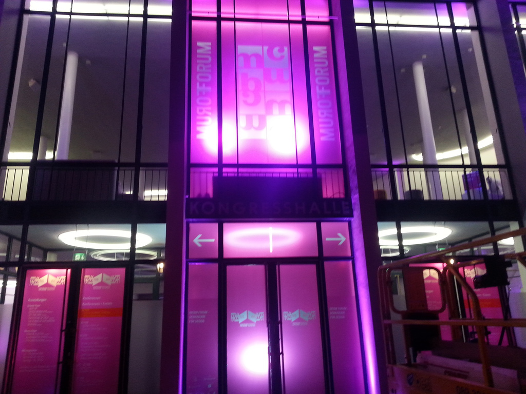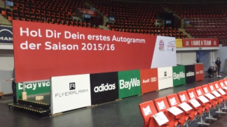 ca, 15m Alurahmen mit Stoff bespannt und div Folienschriften zum Saisonstart des FC Bayern Basketball montiert.